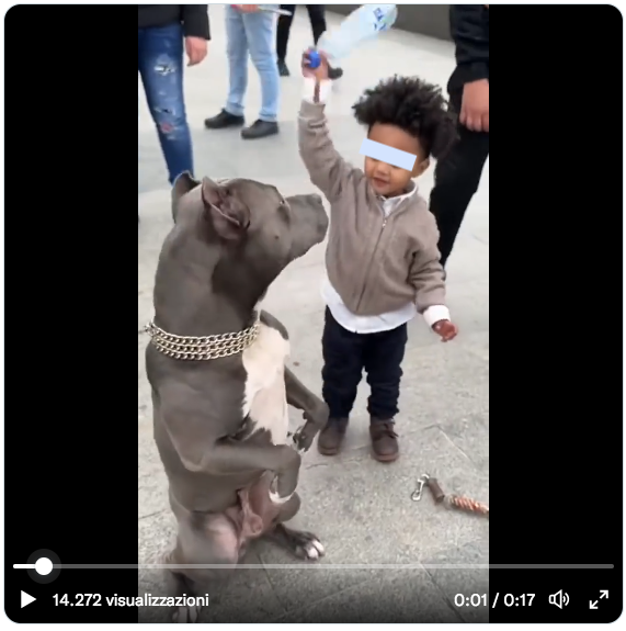 Alle sue spalle si avvicina un bambino che ha in mano una bottiglia, per fortuna di plastica, e gliela picchia sulla testa. Il padrone dice no, rivolgendosi sia al cane (per prevenirne una reazione) sia al bambino, per fargli capire che sta facendo qualcosa di sbagliato. Il bambino caracolla più in là, lo si vede prendere a bottigliate le mani di un adulto, ma poi decide che è molto più divertente prendere a bottigliate il capoccione del cane e torna sui suoi passi per assestargliene un’altra. Il Pitbull è ancora “in piedi” sulle due zampe, per soddisfare l’orgoglio di papà nel mostrare la docilità di cotanto cane. Al secondo colpo gira la testa per informare il bimbo che essere presi a bottigliate non è la sua aspirazione, almeno per quel giorno. Il bimbo fa per allontanarsi ma… forse solo allora la sua testolina elabora di avere uno spettatore (o forse anche più di uno, che però non compare nel video) che ride osservando la scena e un altro che lo filma col telefonino. Galvanizzato dal successo della sua performance, decide di prodursi in un tris. Altra bottigliata.