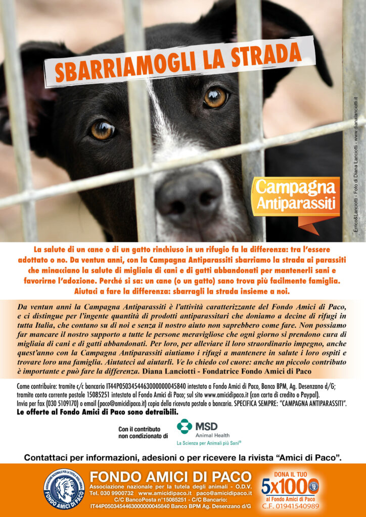 Nonostante le difficoltà di raccolta fondi, è in corso la 21a edizione della Campagna Antiparassiti del Fondo Amici di Paco, l’iniziativa più importante e impegnativa per aiutare i canili e i gattili a mantenere in salute i loro ospiti e favorirne le adozioni. Non fateci mancare il vostro prezioso sostegno!