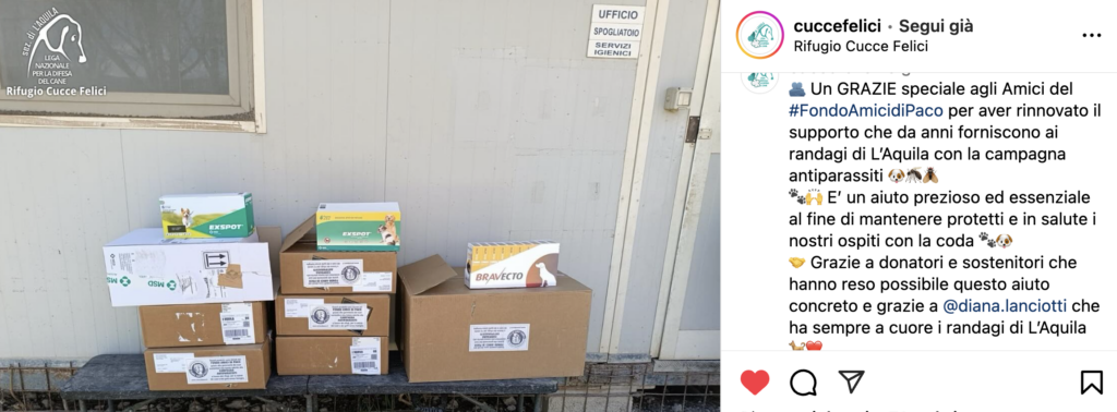«Sì, sperando di far capire l’importanza di continuare ad aiutarci. Negli ultimi anni anche gli abituali sostenitori del Fondo Amici di Paco, che leggono direttamente sui social gli appelli dei vari rifugi, optano per fare donazioni dirette. È encomiabile, però antieconomico. Mi spiego senza giri di parole: è importante sapere che i 10 euro dati al singolo rifugio valgono meno, molto meno, dei 10 euro dati al Fondo Amici di Paco. Infatti, poiché acquistiamo ogni anno e da anni migliaia di dosi di antiparassitari per donarli ai rifugi, per le aziende e i grossisti siamo dei “grandi clienti” e in quanto tali otteniamo condizioni molto più vantaggiose di quelle che spunterebbe il singolo rifugio che compra, ammesso che ne abbia i mezzi, qualche decina o poche centinaia di dosi. È una semplice legge di mercato: chi compra grandi quantità di un prodotto ottiene sempre degli sconti maggiori rispetto a chi compra poco. Ciò significa che quei famosi 10 euro, con cui il singolo rifugio farebbe poco o niente, sommati a tutti gli altri 10 euro dati al Fondo Amici di Paco ci permettono di aiutare non solo “quel” rifugio, ma decine di rifugi. Perciò invito i nostri sostenitori a continuare a sostenere la nostra Campagna antiparassiti, per aiutare non solo uno, ma decine di rifugi. L’anno scorso ne abbiamo aiutati addirittura più di 60 e spero che riusciamo a farlo anche quest’anno. Quasi quotidianamente riceviamo nuove richieste e per me è una grossa sofferenza dover dire di no.»